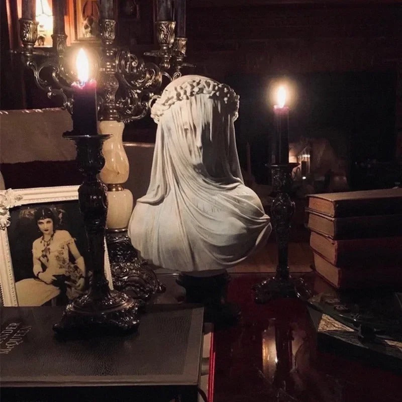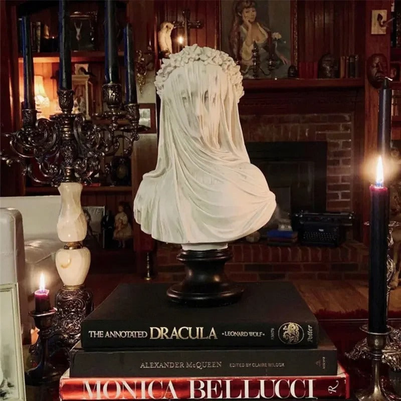 Combining classical beauty with modern resin craftsmanship, this veiled maiden bust brings sophistication, artistic depth, and dramatic presence to any interior setting.