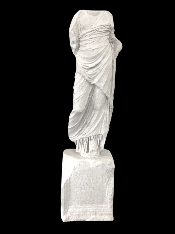 Standing at an impressive 217 cm (84.6 inches) in height, this life-size statue commands attention with its grandeur, while its carefully detailed folding of the clothes adds a layer of realism that makes it feel as though it has just been uncovered from an archaeological dig. The applied patina mimics the aged appearance of classical sculptures, giving the piece an antique, weathered look that evokes the mystery and allure of ancient civilizations.