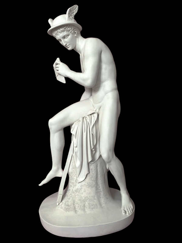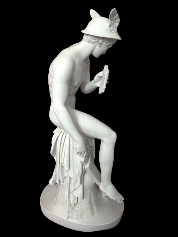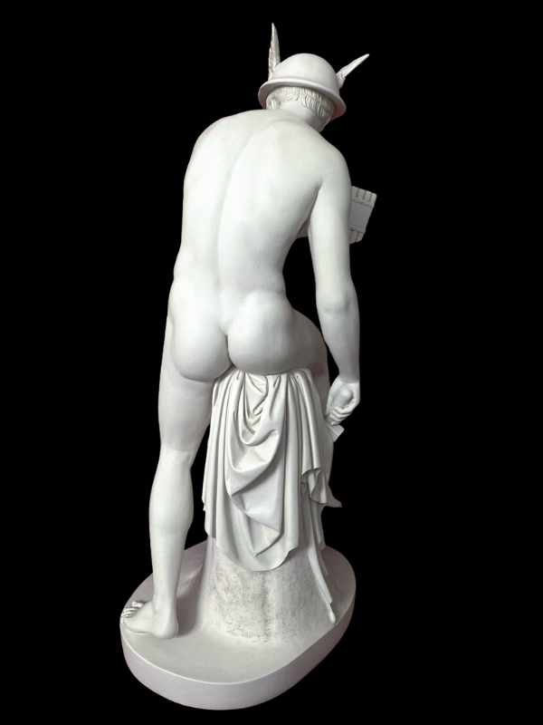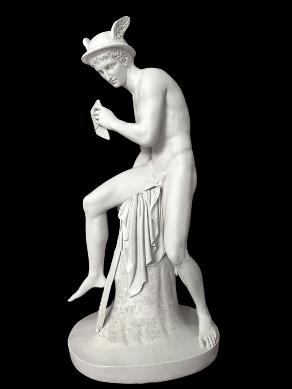 In art, Mercury has been depicted in various ways throughout history. In ancient Roman frescoes, mosaics, and sculptures, he was typically shown as a youthful, athletic figure, exuding energy and speed. During the Renaissance and into the neoclassical period, artists like Thorvaldsen revisited Mercury with a sense of reverence, imbuing his figure with elegance and restraint. This particular statue reflects this shift in artistic sensibilities, portraying Mercury in a more tranquil, seated position, suggesting contemplation and wisdom rather than action alone.
