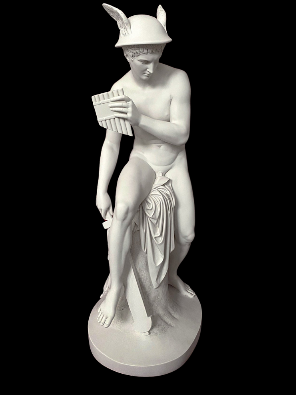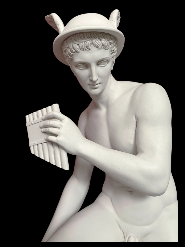 Mercury was also a psychopomp, responsible for guiding souls to the underworld. This aspect of his divine duties made him a figure who straddled the boundary between life and death, a divine entity who facilitated transitions and communication between realms. His complex persona is elegantly encapsulated in this statue, where the juxtaposition of the sword, symbolizing his swiftness and readiness to act, and the pastoral pipes, indicative of his pastoral and poetic aspects, reflect the duality of his nature.